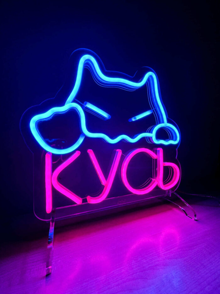 Неоновая вывеска с надписью «Кусь» и с крадущимся котом (30 х 26 см.)